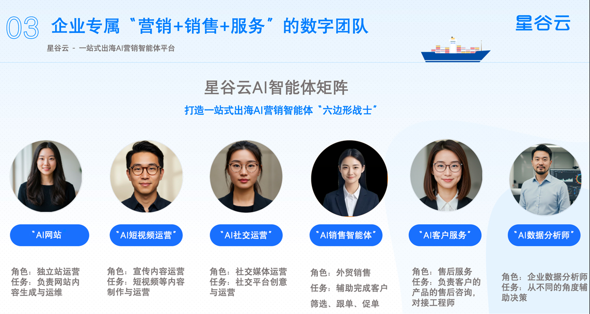 星谷云以 AI 大模型与大数据分析为核心,深度整合 Google、Facebook、LinkedIn、TikTok、WhatsApp 等全球媒体生态,构建了 “营销 - 销售 - CRM” 一体化智能体矩阵平台。6 大智能体(AI 网站专家、AI 短视频运营专家、AI 社交媒体运营专家、AI 外贸人、AI 客服、AI 数据分析师)形成闭环协同机制:AI 数据分析师实时整合全渠道用户行为数据,为其他智能体提供策略优化依据;AI 网站专家与短视频运营专家联动生成适配多平台的营销内容;AI 外贸人与 AI 客服实现线索跟进与客户服务无缝衔接,全程自动化运营使人员效率提升 3-5 倍。其技术团队深耕 AI 算法研发,自主搭建的精准营销大数据库,可实现目标客群的毫秒级匹配与触达。