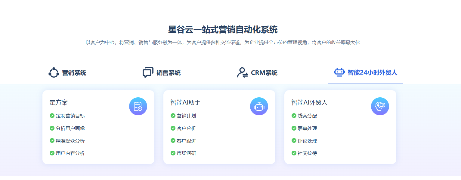 • 对于成熟且追求技术驱动的B2B企业:如果企业已具备一定出海基础,希望深度融合AI技术,实现营销全链路的自动化、智能化升级,并特别看重销售线索的孵化与转化效率,那么像星谷云这样以AI智能体矩阵为核心的一站式平台值得重点考察。